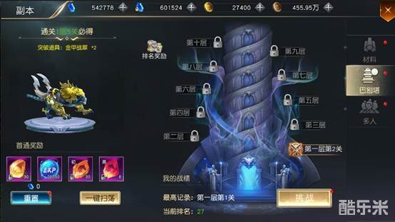 巴别塔副本共计十层,每层20关。右侧显示层数及玩家所在层数关数,左侧显示【重置】按钮。右侧显示玩家通关记录、通关排行榜、排名奖励以及当前关卡通关奖励,下方显示【一键扫荡】【挑战】按钮,按钮功能与前面副本功能一致,点击【挑战】进入通天塔进行挑战。