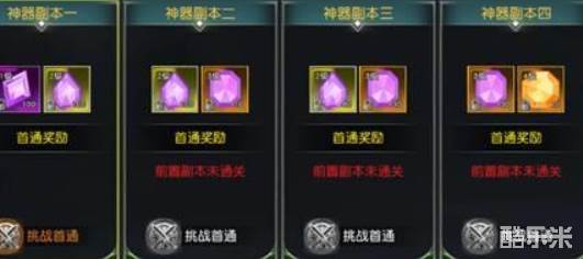 界面上面显示材料副本种类,共计六种:魔骑副本、升星副本、神器副本、强化副本、魔羽副本、披风副本;每种副本下有6个副本,具体已列在下方表格中;点击界面右下角【挑战】按钮进行挑战,通关后获得奖励,之后可选择使用【一键扫荡】功能,直接获得奖励;