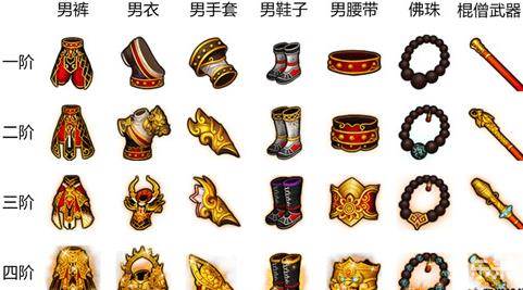 《少林伏魔录》中的装备图鉴延续游戏整体的写实风格,其中棍僧装备图鉴以金、黑、红为主色调,通过颜色比例区分装备品质,装备品质越高金色比例越高,突出了金色在佛教文化中的重要性。
