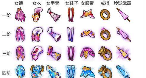 玲珑装备图鉴以粉色和蓝色为主色调,突显出角色活泼的、轻快的性格。初级装备以粉色为主体,顶级装备则以蓝色为主体。图鉴样式多变给人以不同的视觉体验。