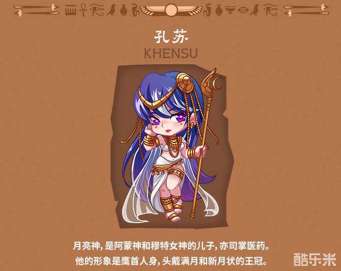月亮神,是阿蒙神和穆特女神的儿子,亦司掌医药。他的形象是鹰首人身,头戴满月和新月状的王冠。