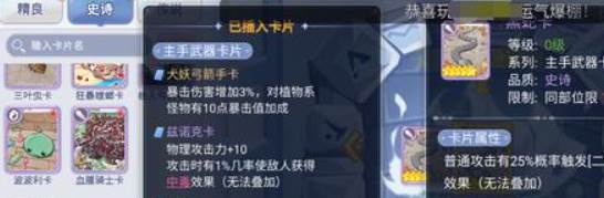 辅助武器可以选择沙漠暮风组合套装,搭配这个套装的时候切记不要使用大剑或者是单手剑。至于其他的橙色的暴击类型卡片,可以考虑三个哥布林卡。要是想提高暴击数值的伤害可以选择给自己的主武器搭配流氓卡,这个卡满星的时候能够有15%的暴击加成。