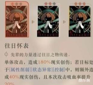 技术:第一个小技术“往日怀表”初始可形成180%的单体损伤,并且假如射中的方针身上有debuff或许操控,那么这个损伤数值还会添加到220%,别的这次的损伤还具有必定的吸血效果。它的损伤倍率是比较不错的,比较大都人物那只需200%乃至更低的倍率来说,实践的输出效果要好上不少,并且技术自身供给的吸血也是比较有用的,究竟只需时间确保血量的健康后续的输出才干安稳。