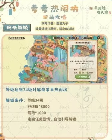 桃源深处有人家果果热闹坊的玩法攻略如下:等级达到34级,舒适度8000,铜钱1000即可解锁。完成任务剧情后会自动引导解锁。修复升级藤藤树可以获得福禄果,提升人气值,建造、升级坊内的装饰可吸引更多的萝萝,增加热闹坊收益。建造、升级坊内的装饰和食物台都会带来收益提升。提高人气值有助于升级建造更高等级的食物台和坊内装饰,让坊更具魅力。