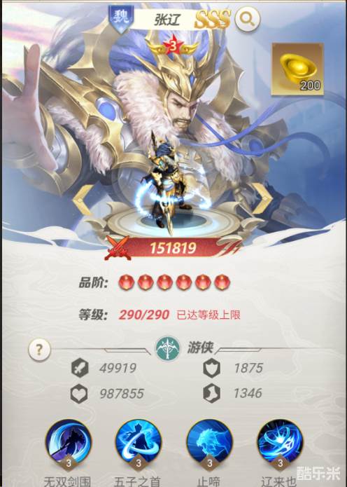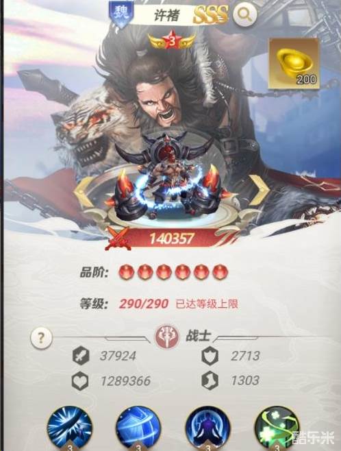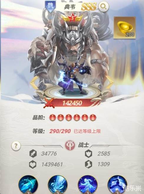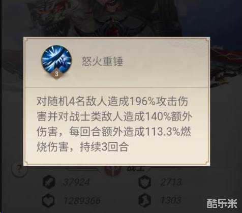十四万二千四百五的战力当属全游戏的第二人,并且其主动技能可附带敌人最大生命值21%的高额伤害,而且该技能的目标范围正好是敌人前排,所以可谓是坦克杀手,另外其被动技能还可以给他提供偷取护甲和额外的破甲效果。