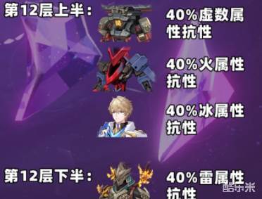 这期十二层的特点可谓是特定属性抗性限制的死死的,上半一共五个怪,四个都有额外属性抗性,限制了火、冰、虚数角色,我的建议是可以考虑选择景元或卡芙卡的雷c阵容,或善于跨属性执法的希儿量子队