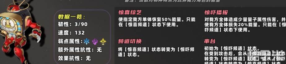 圆幕先生(电视机)其实算小怪,单独拉出来分析是因为它的机制很有意思:通俗来讲也就是说它的技能释放与屏幕显示的表情有关,如果轮到它行动时为笑脸,则为我方单体恢复50%能量;如果轮到它行动时为惊吓表情,则使我方全体扣除20%能量并受到伤害;其中有一个技能可以转换屏幕的表情,但仅能把【惊喜】便为【惊吓】;