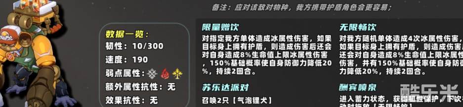 甜猿泰山的难点其实并不在它的护盾反伤机制,而是它召唤的【气泡锂犬】,气泡锂犬在被消灭时会让其相邻单位的速度提高并挂上裂伤,敌方行动加快的收益除了克拉拉之外最明显的则是dot队,触发敌人头上的持续伤害的频率会加快;这样看来看似在抬护盾角色,还小抬了一下dot队