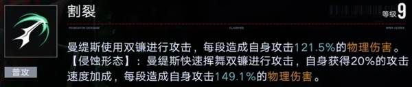 曼缇斯的普攻也会有两种形态,其中侵蚀形态的攻速会提升20%,基础攻速会提升到约1.2左右,而在10级时侵蚀状态的普攻倍率高达161%。