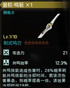 在武器选择方面,先推荐各位使用我们的制式鸣刃音阶铭斩,是目前最好用的单体剑之一。基础攻击21,共鸣效率12.3,在共鸣技能造成伤害的时候,有26%的概率直接刷新我们的共鸣技能冷却时间,此次伤害暴击则会概率再提升一倍,冷却效果28秒。