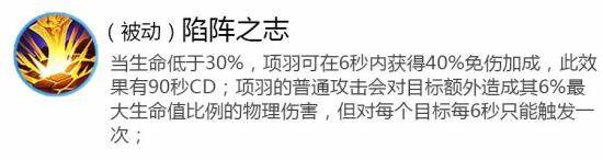 被动能为项羽提供40%的减伤效果,抗伤害效果简直逆天。需要注意的是开团前一定要确认自己是否有被动,在项羽触发被动时,脚下会发光,这段时间才有免伤效果。