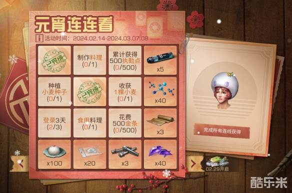 一起过节才热闹,2月22日至3月6日,邀请好友共同参与双人集训,完成指定任务可获得大量熟练度和元宵团子,参与商队支援还有额外奖励哦!