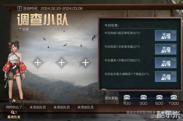 唯有团结才能征服废土!2月22日至3月6日,4人幸存者调查小队启动,完成每日任务获得调查值,个人和团队调查值达到一定阶段将解锁强化血清、异变晶币、潜能胶囊等丰厚奖励,快去寻找并肩作战的队友吧!