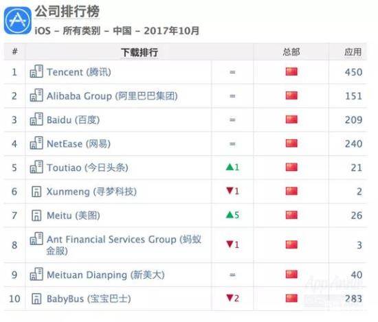 据App Annie日前发布的10月中国iOS应用下载数据,虽然BAT、网易等大公司依然主导中国iOS市场最大的下载量,但今日头条、美团点评等独角兽公司已经杀入以BAT为主的top 10 榜单中。