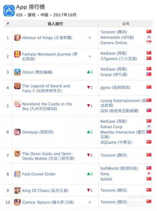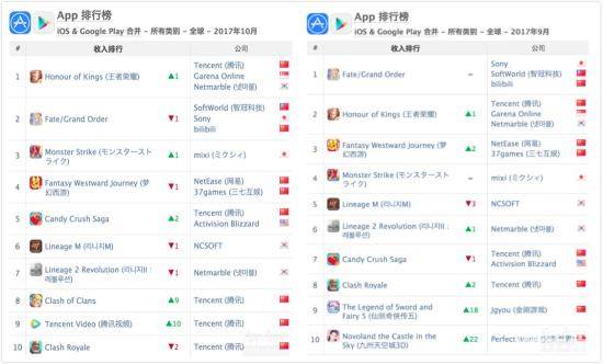 在收入榜单中,10月《王者荣耀》超越《Fate/Grand Order》成为全球最赚钱的游戏。
