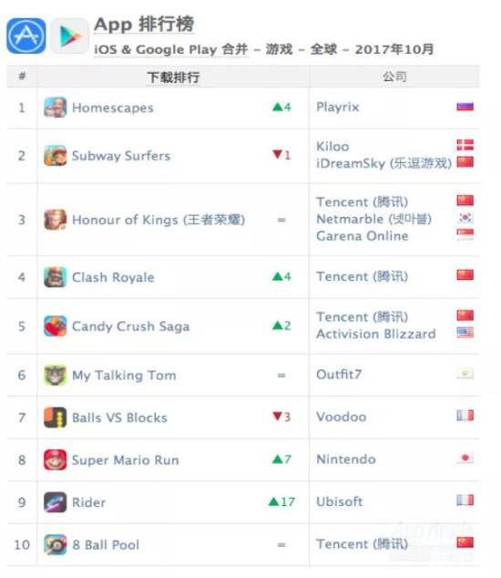 而 Playrix 8 月新上线的游戏《梦幻家园 (Homescapes)》 则上升 11 位至下载综合排行第 8 名,表现不俗。在游戏排行榜中,《梦幻家园》10 月超过了《Subway Surfers》,位列全球1下载量第一 。