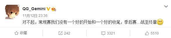 对于生而无畏战至终章的QGhappy来说,此次的失败无疑是个很让人意外的结果,在诸多的议论声中,QGhappy的队员们更是纷纷向粉丝们致以歉意。首先Gemini微博发声,内心充满愧疚,表示没能在常规赛带来一个好的开始和好的收尾,十分遗憾。