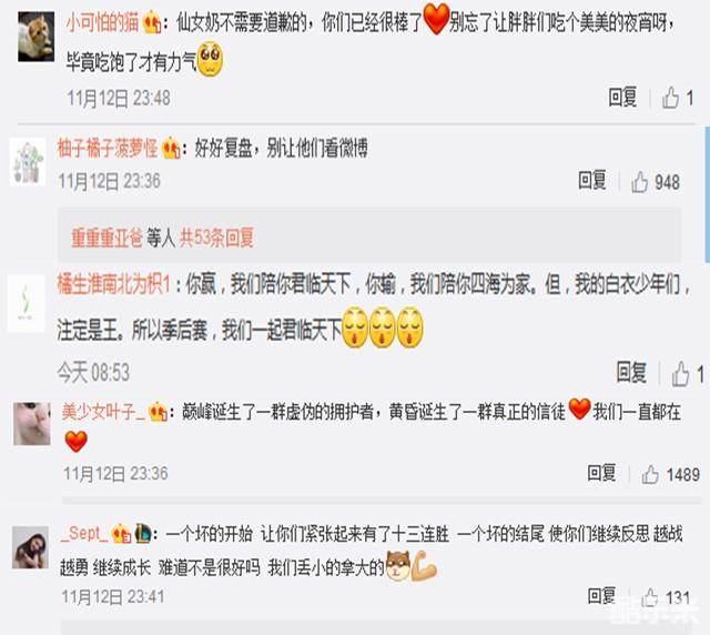 不止教练,队员们也站出来承认是自己的失误会好好总结,好好备战。在刺痛的微博下粉丝十分担心自己的信仰压抑了他们,悉心疏导他们的情绪,满屏小心心十分温暖。