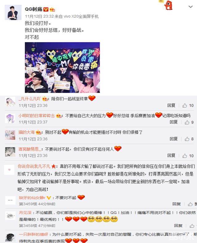 当然还有一些队员因为在比赛之前就已经闭关了,所以大家这次没有看到他们前来同粉丝们说话。猫神在11月11日就退出了微博,全新全意备战接下来的季后赛,所以大家暂时看不到他们啦!不过相信每个QG队员都挂念着粉丝的,备战是了在季后赛给大家带来一个更好的表现,让我们一起期待!