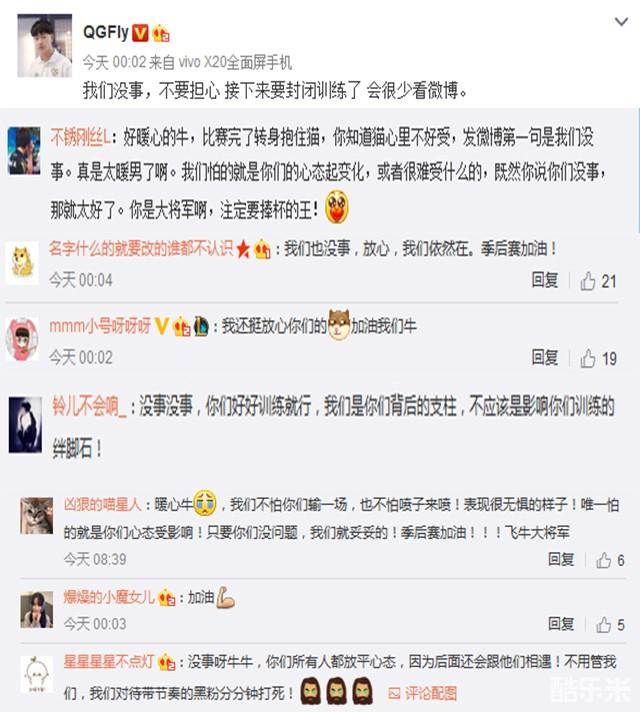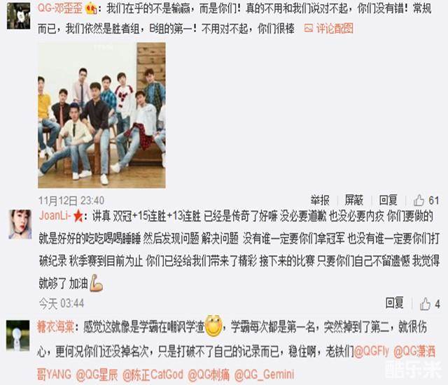 然而QGhappy的粉丝们却对这么奶教练的道歉并不“买账”,纷纷表示:无需道歉,你们是最好的QG!不论输赢,你们是我们心中永远的英雄!更有粉丝暖心回应,表示好好复盘,给胖胖们吃个美美的宵夜,虽然输了比赛,但是胖胖们还是要加鸡腿的,不然饿瘦了可就不好了呀~