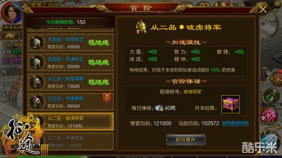 功勋值也能提升战力,虽然提升的战力值不算多,但是在官职里面有一条,对于低于本官阶的玩家造成10%的伤害,这也是非常具有杀伤力的,所以没事的时候多做做基础任务,多做做军功,收获也是不小的。