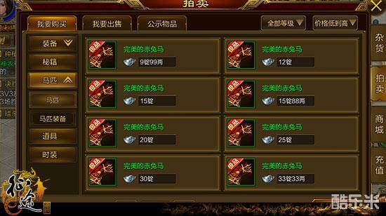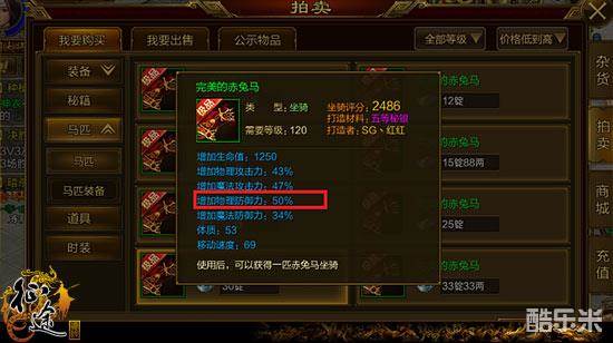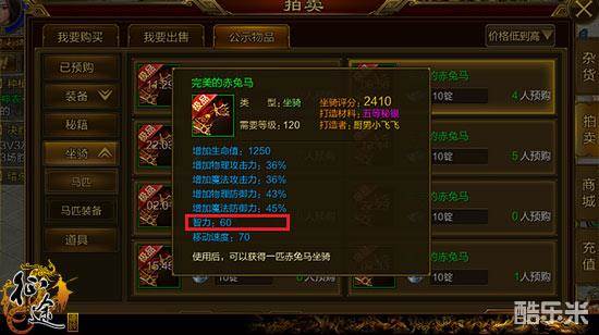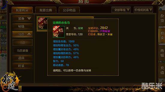决定去拍卖行购买赤兔马后,首先要确定的大方向是购买打造材料是五等秘银、六等秘银,还是购买神兽。五等秘银打造的赤兔马,增加生命值是1250,增加的百分比稍低一些,评分一般在2100-2600;六等秘银打造的赤兔马增加生命值是1500,增加百分比稍高,评分一般在2700以上。神兽增加生命值是2000,增加百分比都是70%,后面的主属性和移动速度都是80,价格自然也是比较昂贵的。具体如何选择,还是看自己的银子数量。