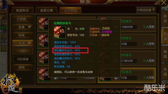 前言:去拍卖行购买赤兔马,首先要决定是买五等、六等材料打造的还是购买神兽;接下来要决定的是直接购买还是预购。两大方向决定后,要依次查看主属性、增加攻击力百分比、增加物理魔法防御力的百分比数值。
