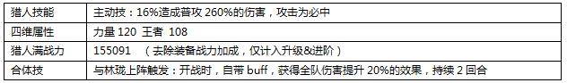 尔多,重击流的核心猎人之一。不低的技能触发概率加上高力量和高王者,想想都知道这暴击和伤害是要爆表啊~~更何况还有和林珑的合体技,这简直就是敌人的噩梦。提升阵容整体暴击和伤害就一定不要错过尔多~~