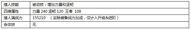 小林,没有主动技能,是重击流中的另一个属性猎人。没有主动技和合体技,只能通过给阵容增加四维属性来体现价值。有着超高的力量,坚韧和王者。在考虑阵容整体属性时,要记得让小林上阵。