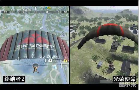 评价一个游戏优劣与否,画面是第一要素,也往往是留给玩家们的第一印象。通过最初跳伞阶段的画面对比,我们不难发现,《终结者2:审判日》降落伞建模的刻画更为细腻,光照的反射效果清晰可见,而《光荣使命:使命行动》无论是伞上的红色线条,还是整体造型,都透露出一种临时赶工的廉价感。虽然降落伞在这个游戏中并不是最核心的道具,但这个细节的巨大差距,还是体现了两款产品的制作水准和态度。