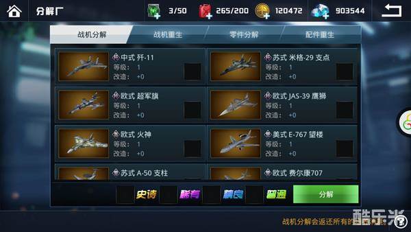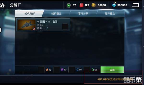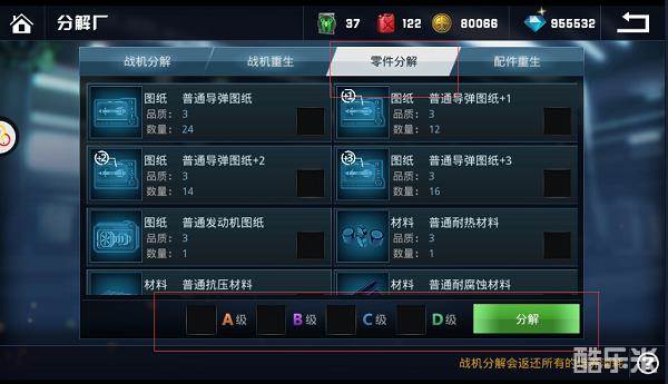 在《血战长空》手游主界面中,找到分解厂,当玩家有多余战机和零件、配件时可以分解,分解可以获得对应材料,如图所示: