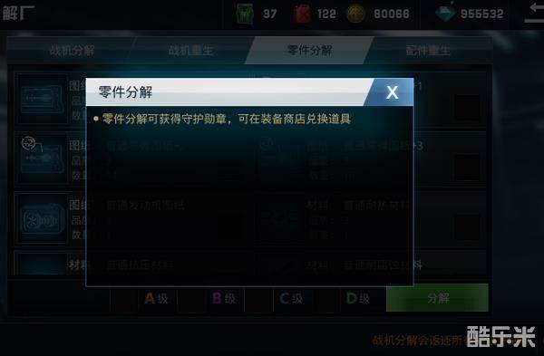 零件分解可以把多余的零件分解获得守护勋章,可以再装备商店兑换道具,如图所示: