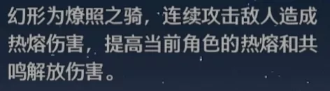 技能为:幻形为燎照之骑,连续攻击敌人造成热熔伤害,提高当前角色的热熔和共鸣解放伤害。(简述)