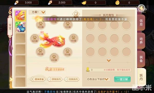 4、最后就是宠物妖丹啦,给宠物镶嵌妖丹可以大幅提高宠物战力,但是需要主角达到100级才能镶嵌。