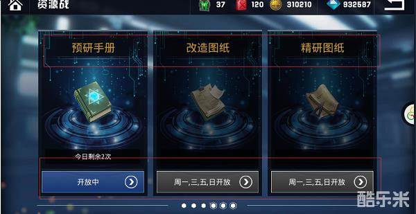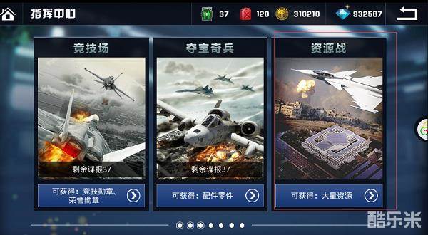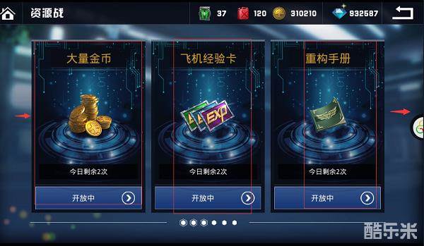 资源战副本分为6个方面,分别为金币、飞机经验卡、重构手册,预言手册、改造图纸、精研图纸(金币、飞机经验卡、预言手册、重构手册副本每天开启,其他2种周一、三五日开放,周末全部开启)