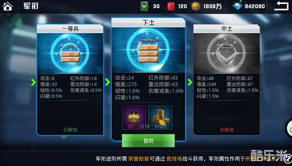 可以通过提升军衔等级来获得相应的属性加成。