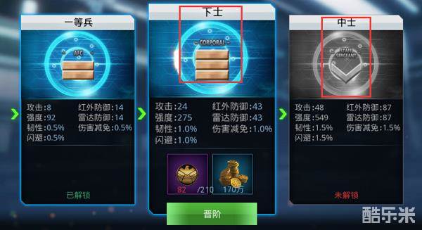每次提升都获得更高的属性加成,军衔标志也会随着变化。