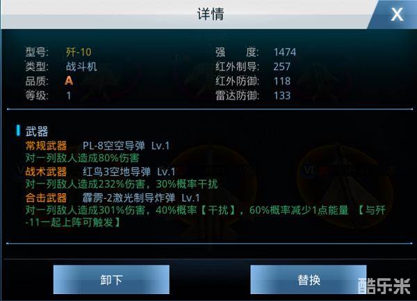 十分霸气的造型,普通攻击是对一列敌人造成伤害,技能是对一列敌人造成大量伤害并一定几率干扰,合击技能是对一列敌人造成大量伤害,一定几率干扰,大概率减少1点能量。这里给大家解释下,干扰意味着一个回合无法出手。减少一点能量,会导致对方能力无法回满,可以有效的限制技能的释放。如果歼-10 再配合其他技能带控制与减能量的战机,将是一个十分强大的阵容。可见歼-10在游戏中也是十分厉害的存在呢!如果是想培养中国战机阵容,那么歼-10绝对值得你拥有!