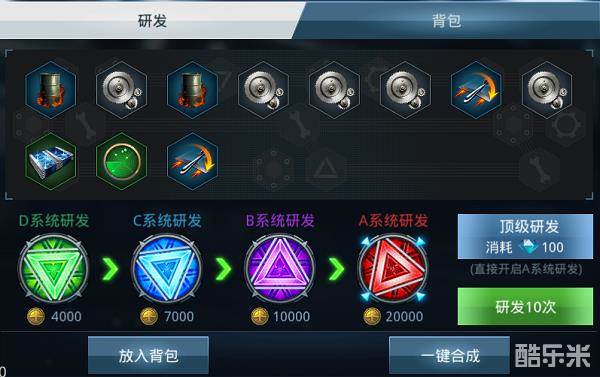 4、一键合成:十分方便快捷的功能,一般与研发10次配合使用,高等级的科研产品自动吞噬低等级的科研产品,紫色品质及以上不会被吞噬。
