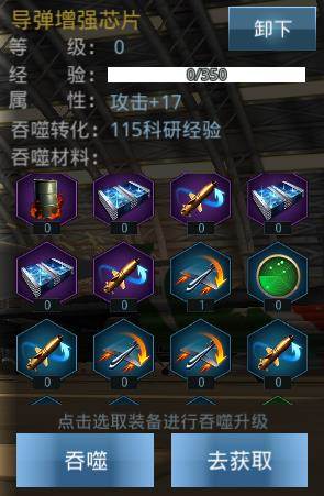 刚研发出来的科研产品等级为0,但可以吞噬其它产品来提升等级,从而提升属性加成,科研产品的品质越高,升级所需的经验也就越多,当然,提升的属性也就越多。具体操作为:点击已装备的科研产品,在吞噬材料列表中选择要吞噬的材料,再点击吞噬。