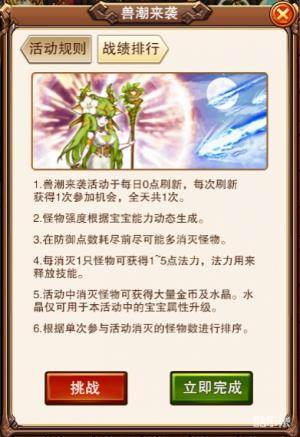 兽潮来袭作为一个重要日程活动的组成部分,每天只有一次参加机会,各位勇者且珍惜。初期家园拥有10点的防御值,当10只怪物攻入家园即宣告你的失败。消灭怪物的主力的宝宝,勇者可以使用法力释放各类技能助阵。