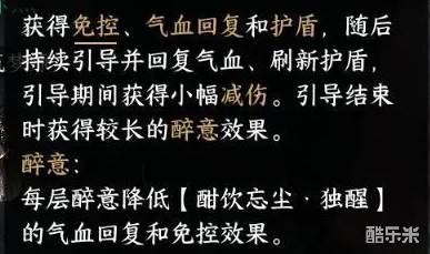 获得免控、气血回复和护盾,随后持续引导并回复气血、刷新护盾,引导期间获得小幅减伤。引导结束时获得较长的醉意效果。醉意:每层醉意降低【酣饮忘尘,独醒】的气血回复和免控效果。