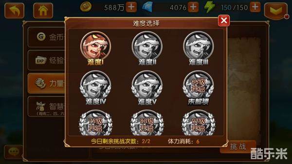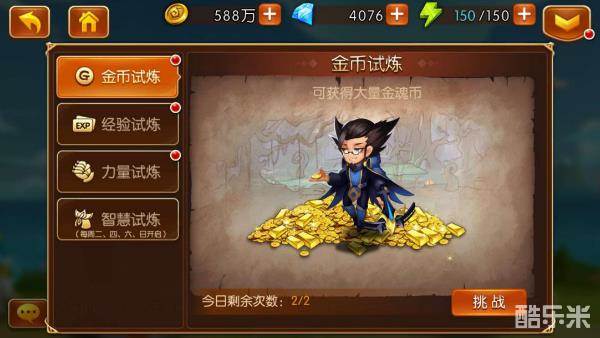金币试炼:每日都会开放,并每天有2次机会挑战(不可购买次数),挑战后会获得大量的金币。