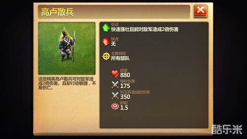 高卢散兵便是启蒙时代的最强步兵。作为战术兵种,可额外作为兵力使用,而且高卢散兵的使用不限时代,强力的属性加上破坏力将让掠夺资源更加方便。