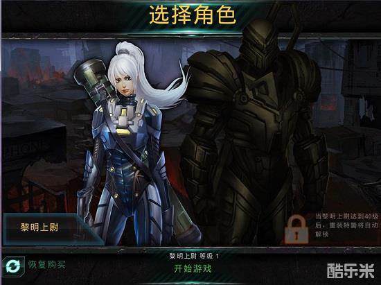 已进入游戏,首先是选择人物的界面。这里有一男一女两个人物可以选,不过刚开始玩都是只能用女性角色的,只有女性角色玩到40级,或者花6元购买,才能开启男性角色。