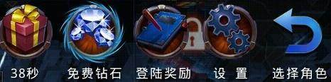 从左到右来说,最左边的礼盒是在线奖励,到时见就可以领取了。免费钻石,顾名思义就是可以获得免费钻石的地方。登入奖励是每天登入就可以领取的,记得天天登入来领呀,里面有很多好东西。设置可以进行游戏的基础设置。选择角色是返回角色选择界面。