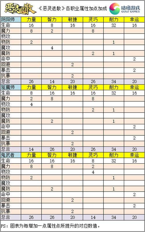 截止目前,《恶灵退散》各职业属性点加成一览: