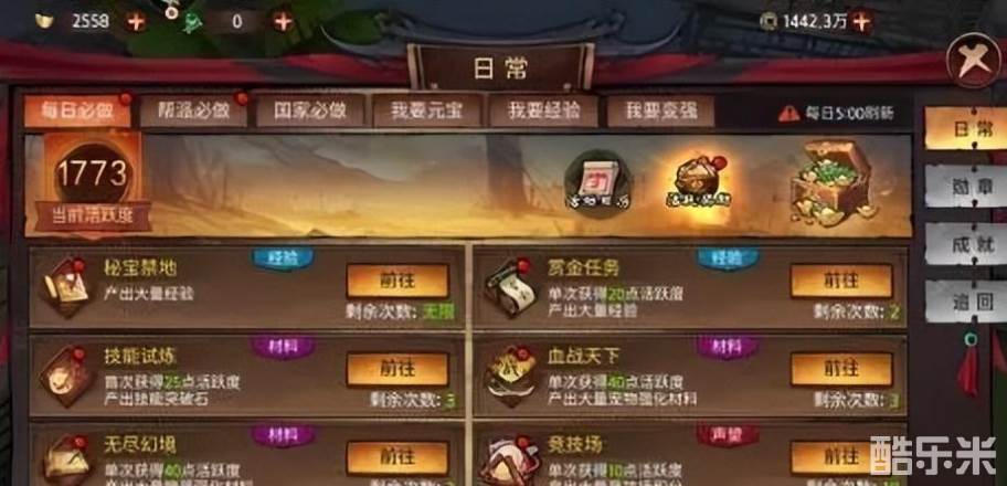 通过以上掉落途径,再根据我们选择的职业来判定我们参与玩法的优先级顺序,以我玩的刺客职业举例,刺客职业是一名纯输出类职业,不提坦度,不提防御只要输出,在前期没有解锁过多玩法的情况下优先提升角色等级,参与秘宝禁地,赏金任务等高经验掉落的玩法,达到要求后,可以追求自身装备品质,将当天boss挑战次数打满,随后参与一些无尽幻境,血战天下等玩法拿一些养成材料提升装备强化等级或者是阶级,再或者是宠物等级等等(在有活动系统的加持下,前期我们的铜钱和元宝是非常充足的),最后再去做一做主线跟一跟任务进度,拿拿铜钱和元宝。