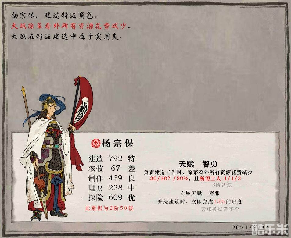 1、杨宗保是建造特级角色,属于实用又好看的类型,算是很不错的新角色;