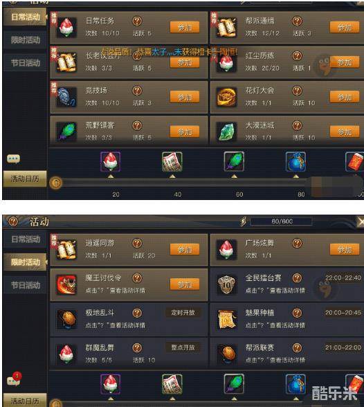 16.帮派联赛:每天21点-23点,在帮派基地领取入侵其他帮派和保卫本帮的任务,可以获得经验、修行点、珍贵物品。